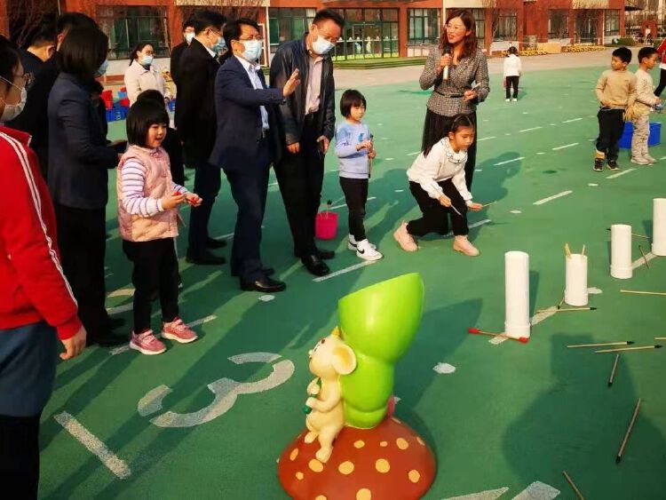 山东省教育厅厅长邓云锋同志一行在赵先德的陪同下和小朋友一起体验中华智慧感统区角玩教具